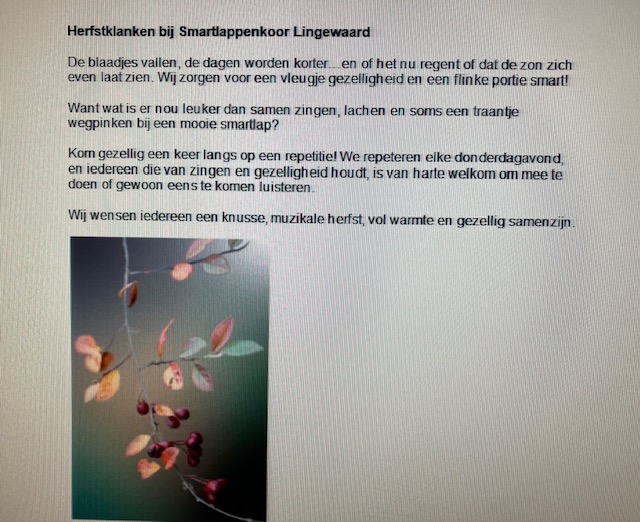 We zingen smartlappen en levensliederen van vroeger en nu, voornamelijk in het Nederlands. Gezelligheid en fijn samen zingen staan bij ons hoog in het vaandel.